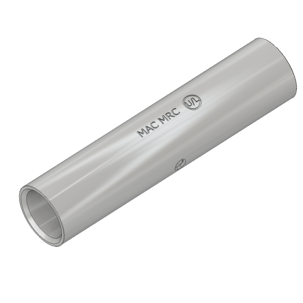 The type MRC long barrel copper coupler is produced in a wide range of cable sizes from #1 Str. to 2000 MCM. Fabricated of pure, seamless copper tubing and tin plated for added corrosion resistance, this end to end cable coupler is installed with standard compression tooling. Center cable stops are provided to assure proper length of cable insertion, and smooth chamfers at each end of connector add to ease of installation. Sizes above 250 MCM are designed for two indents on each end of coupler.
